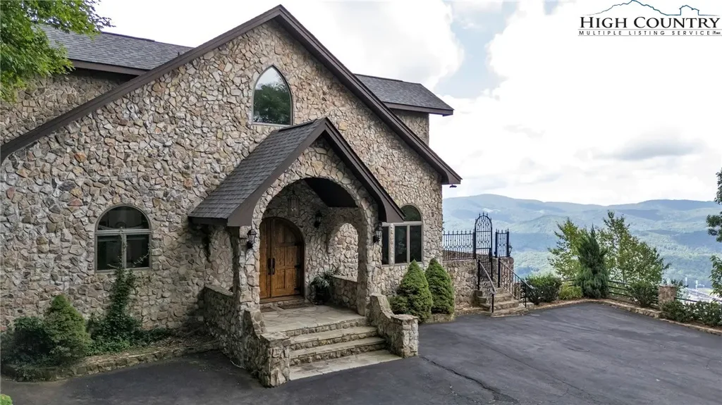 Experience the ultimate in mountain living with this one-of-a-kind property perched atop Howard's Knob, offering breathtaking long-range mountain views, while also overlooking downtown Boone. This custom-built home features spacious rooms throughout, with the main level showcasing an inviting open floor plan. Great room highlights a massive stone fireplace, floor-to-ceiling windows, as well as French doors that open to an expansive stone patio, perfect for soaking in the stunning vistas. Main level also offers a well-appointed kitchen, formal dining room, half-bath, and an impressive master suite. The large master suite is a serene retreat, complete with a rock accent wall, French doors leading to stone patio, and a luxurious master bath featuring separate vanities, a rock shower, and two walk-in closets. The interior boasts vaulted ceilings, arched windows, framed beams, and wide plank hardwood floors, exuding character at every turn. Upstairs, an open den/loft area provides additional living space while showcasing the spectacular mountain views. Each impressive wing offers its own suite, expansive bedroom complete with seating area, full bath, and four closets, ensuring privacy and comfort for family and guests. Adjoining Howard's Knob Park enhances the desirability of this property, making it an ideal haven for nature lovers and outdoor enthusiasts. Experience quality living in this remarkable home, where breathtaking views, quality craftsmanship, and character meet in perfect harmony to offer unparalleled charm.