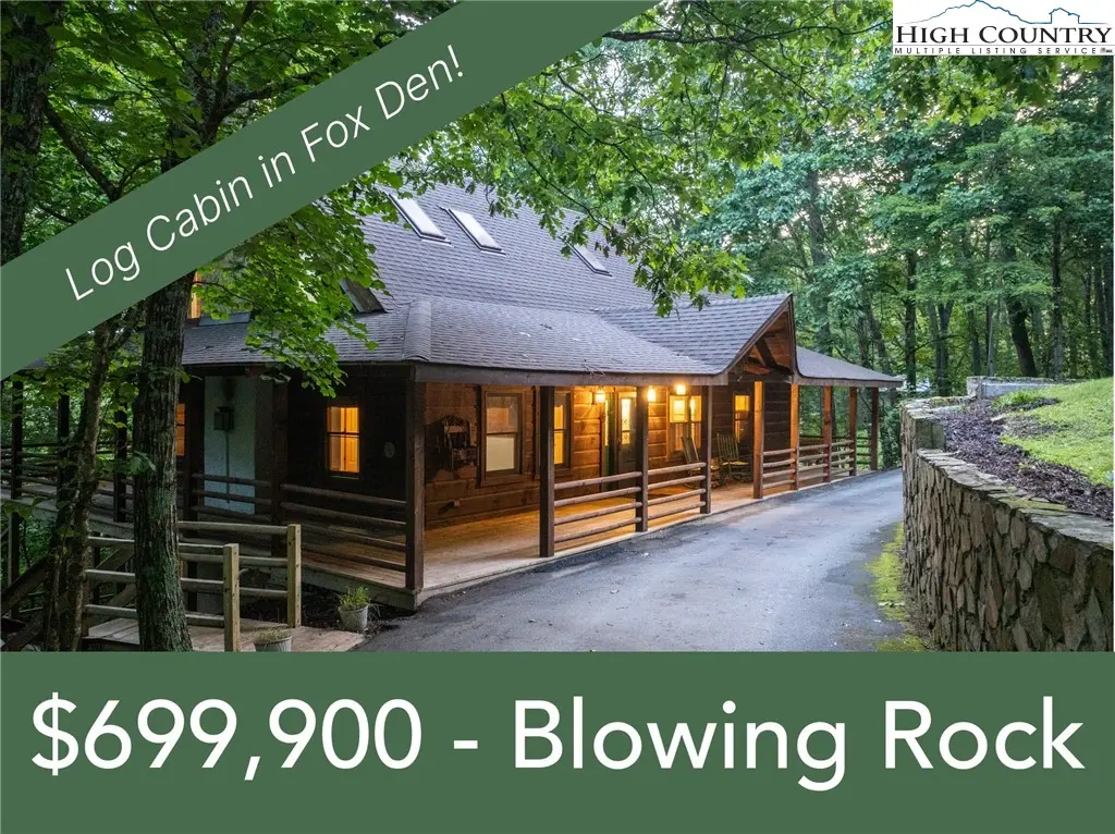 Exceptional Mountain Log Cabin in Desirable Fox Den Subdivision..Entering the Log Cabin with Soaring beamed ceiling and T&G pine, it features a two story stucco gas-log fireplace with tile accents, stained glass window & Mexican tile flooring. Then the spacious great room opens out to 2 huge covered decks. The First floor also features primary bedroom with bath and includes walk-in closet. Then an Open Loft provides one additional bedroom, a bonus room & a sitting area. The Large Spacious Kitchen features Custom Hickory cabinets and Modern refrigerator & microwave and adjoins to the lovely dining area. The downstairs features a finished family room and includes a full bath and an efficiency kitchen with bar seating. The lower level also offers a Huge deck which is accessible from the 2 car oversized garage & big parking area. The upper paved driveway allows for no-step entrance to main level and the beautiful wooded area provides quiet privacy. Brand new roof, May 2025!