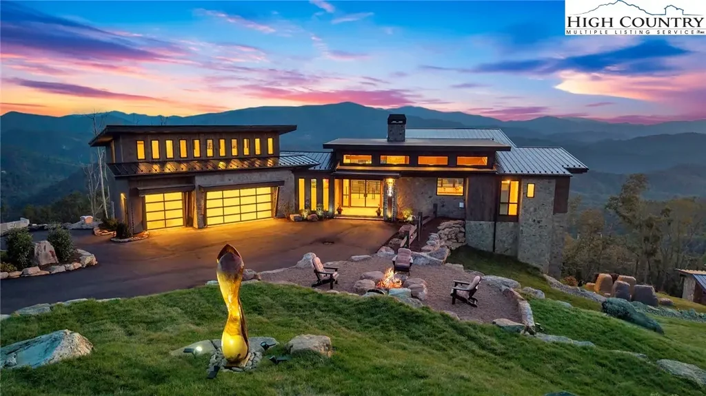 Located in the coveted Sunset Section of The Lodges at Eagles Nest, the Eagles Nest Glass House is an exceptional custom estate redefining mountain living through masterful design and craftsmanship. Developed over three years, this architectural showcase occupies 1.033 acres, where rugged natural beauty blends seamlessly with refined elegance. The residence offers 7,055 sq ft of heated living space, excluding the three-car garage. Perched at 4,400 feet elevation, it commands panoramic views spanning North Carolina to Tennessee mountains, framed by awe-inspiring sunsets. The exterior presents a stylish mountain retreat with white pine-stained wood siding, expansive windows, and rustic metal beams. Over $250,000 was invested in professional landscaping, featuring natural boulders, enhanced lighting, and intricate hardscaping that create an impressive arrival experience. Outdoor living shines with 860+ sq ft of decking, a large hot tub, hand-laid stone pillars, and custom steel beams designed to highlight the sweeping vistas. An inviting fire pit promises memorable evenings beneath the stars. Entry by a grand custom glass door reveals a great room with soaring two-story glass walls that flood the interior with natural light while framing the stunning surroundings. Nickel gap white pine-stained ceilings with rustic beams combine rustic warmth and modern elegance, accented by hand-laid rock, light-toned floors, and a custom rusted gas fireplace. The gourmet kitchen impresses with Onyx Waterfall Island countertops, stainless steel appliances, and a wine cooler. The lower level houses a large custom bar, wine cellar, and a flexible bonus room suited for theater, family gatherings, or games. Throughout are handmade floating handmade stairs, custom wood ceilings, stone accents, custom glass windows, and exterior stonework. There are five spacious bedrooms, each with meticulously finished bathrooms featuring hand-laid stone, marble, various tiles, and teakwood benches. Two additional half-baths are located on each floor. Two generous primary suites, one on the main level and one on the lower level, feature spa-inspired bathrooms and conveniently located adjacent utility rooms. Above the garage, featuring hand painted bronze epoxy floors, lies a distinctive bunk room with a full bath and an expansive rec room. Roughly half of this 275 sq ft area features ceiling heights between 5 and 7 feet. The home is enhanced by commissioned artwork and custom furnishings throughout, reinforcing its one-of-a-kind character. Residents enjoy an extensive amenity offering including ATV and hiking trails, ropes course, playground, dog park, mini-golf, disc golf, archery, versatile sports fields, and courts for volleyball, basketball, tennis, and pickleball. Enjoy world class trout fishing along the Elk River with over 2000 ft of river frontage. Dining options include Eagles Nest Winery, Epic Chophouse and The Sportsman’s Grille. Additional amenities include a 24-hour Dollar General, an outdoor amphitheater offering live entertainment on Saturday evenings from May through October, fitness center, and two helicopter pads. This estate transcends standard mountain homes by flawlessly combining luxury, nature, and architectural brilliance, inviting an elevated mountain lifestyle. Adjacent to this property, a 4,959 sq ft neighboring estate (MLS #258350) is also available, presenting a rare opportunity for main and guest house combination. 4 year home warranty provided